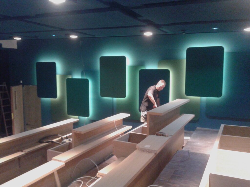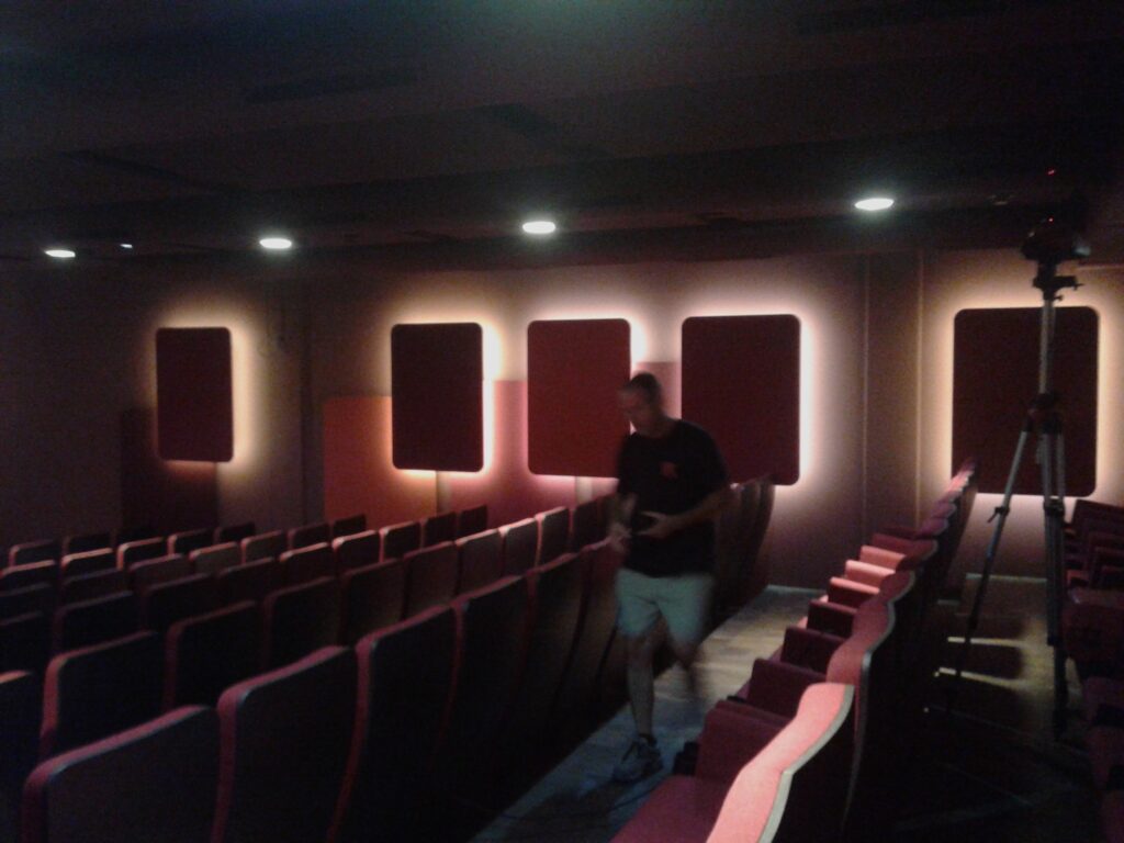 Eine klevere Lichtsteuerung soll es richten: Die von activAudio, Harald Rupf gebaute Beschallungsanlage in den Kinosälen sind mit LED-Streifen hinterleuchtet (siehe Bild). Das Licht wird per DALI-Protokoll an die Kinoautomation angeschlossen. Die eingesetzten Steuermodule (ELDO-LED-Dimmer L100S Non-PWM) regeln das Licht stufenlos. Wirklich bis ganz dunkel, ganz sanft ohne Flackern und ruckeln.