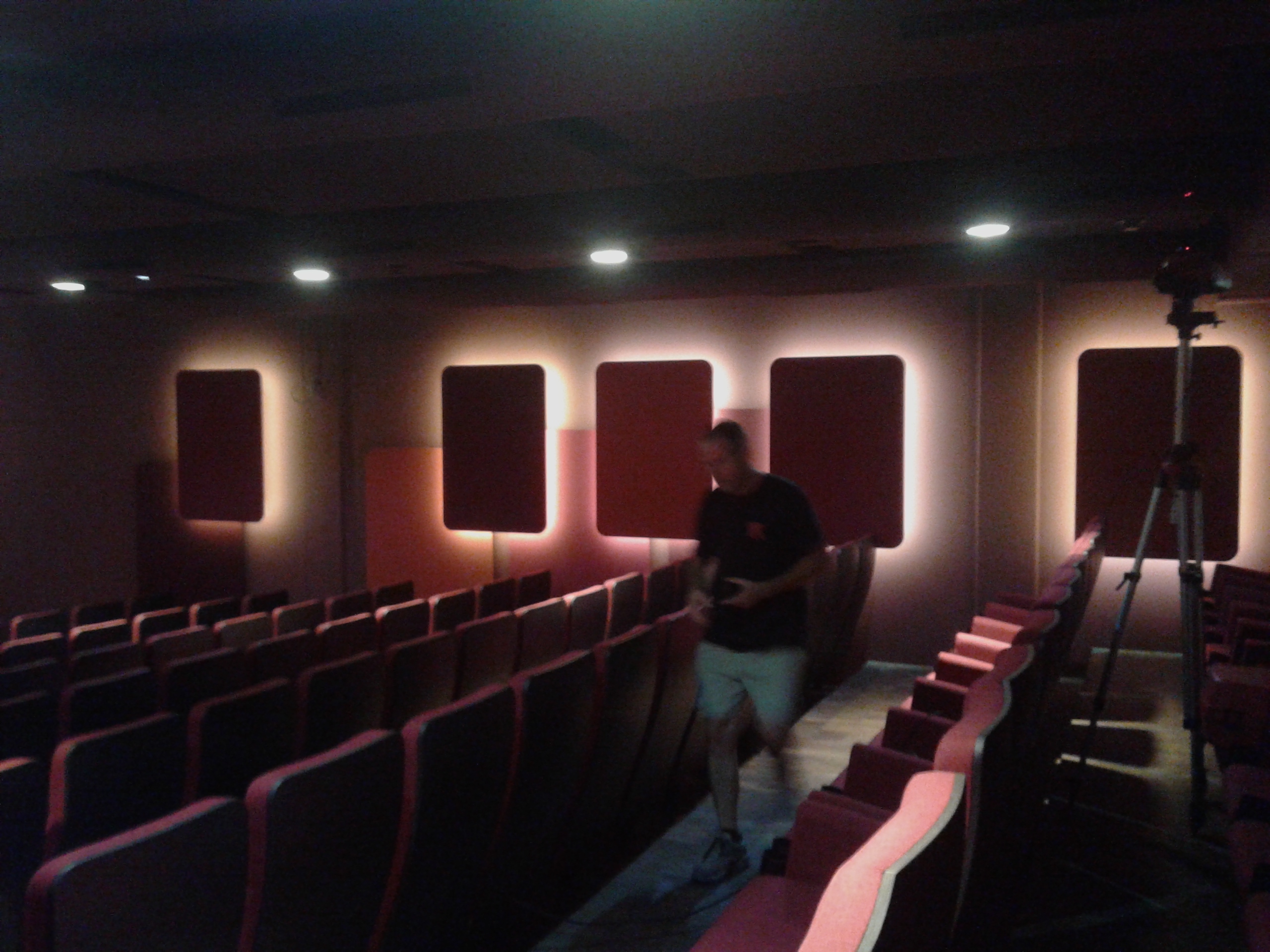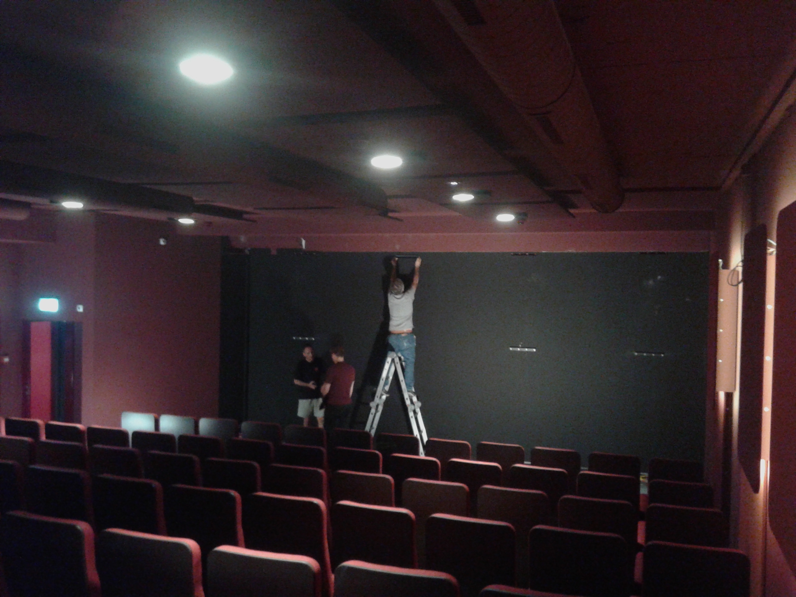 die alte Leinwand ausgebreitet über die KinosesselUrs Schenk und Domink Keller installieren die Lautsprecher Urs Schenk und Domink Keller installieren die Lautsprecher Urs Schenk installiert die revidierten LautsprecherDie neue Leinwand wird durch die Protronic AG installiertDie neue Leinwand wird durch die Protronic AG installiertdie neue Leinwand ist gespannt.Der neue DCP Christie-Projektor wird durch Remi Engler kalibriertDas QSys-System wird durch Remi Engler programmiertUrs Schenk beim Einmessen der Tonanlage