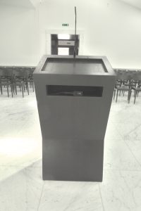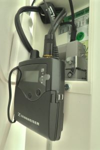 Es sollten sämtliche fliegenden Kabel vom Marmorboden verschwinden. Darum wird das Schwanenhals Mikro am Ambo per Funk übertragen. Zum Einsatz kommt ein Sennheiser SKP 500 G4 Aufstecksender mit Phantom-Speisung zum Einsatz.