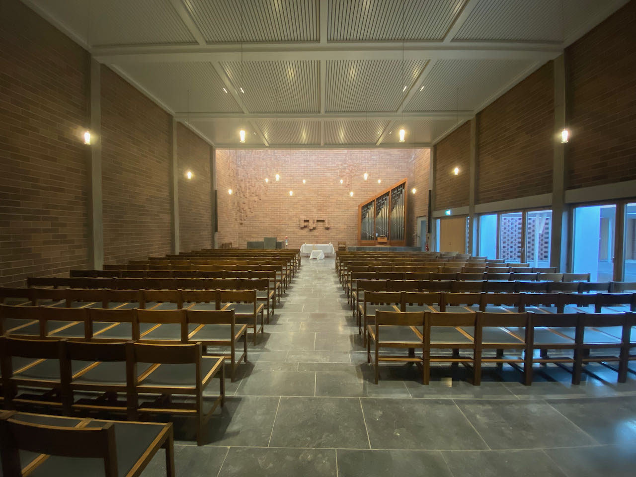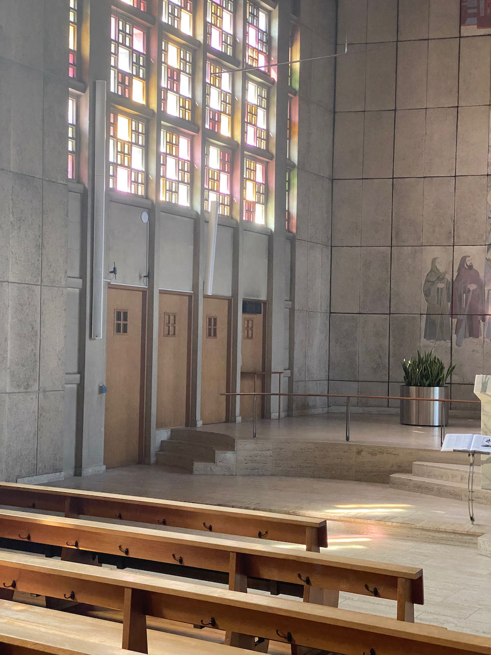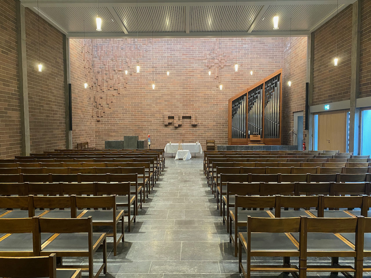 Ein Hauptlautsprecher links beschallt ca 2/3 der Kirchenbänke, die im Halbkreis angeordnet sind. Ein Nebenlautsprecher rechts im Nebenschiff beschallt die „Lücke“ diskret.