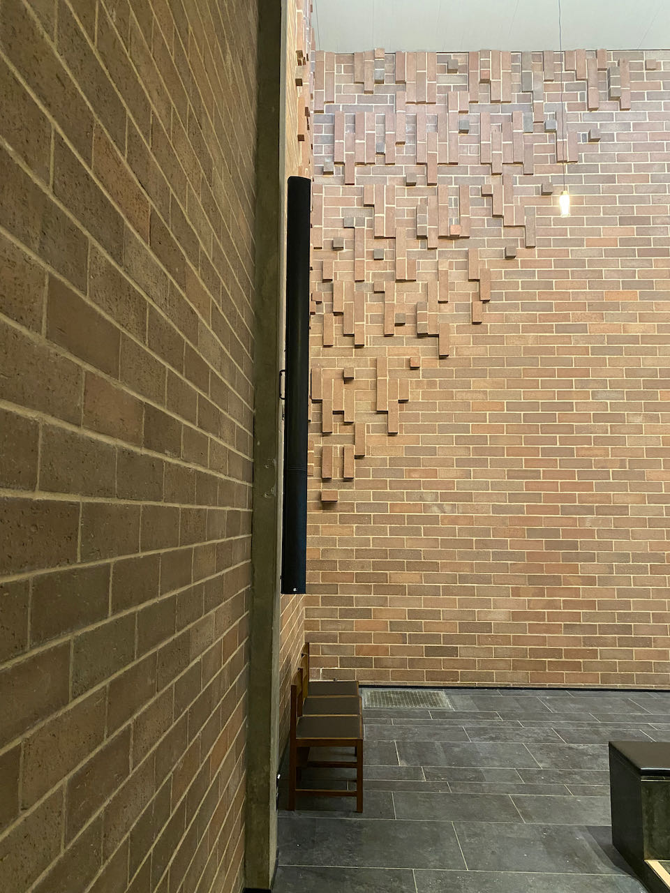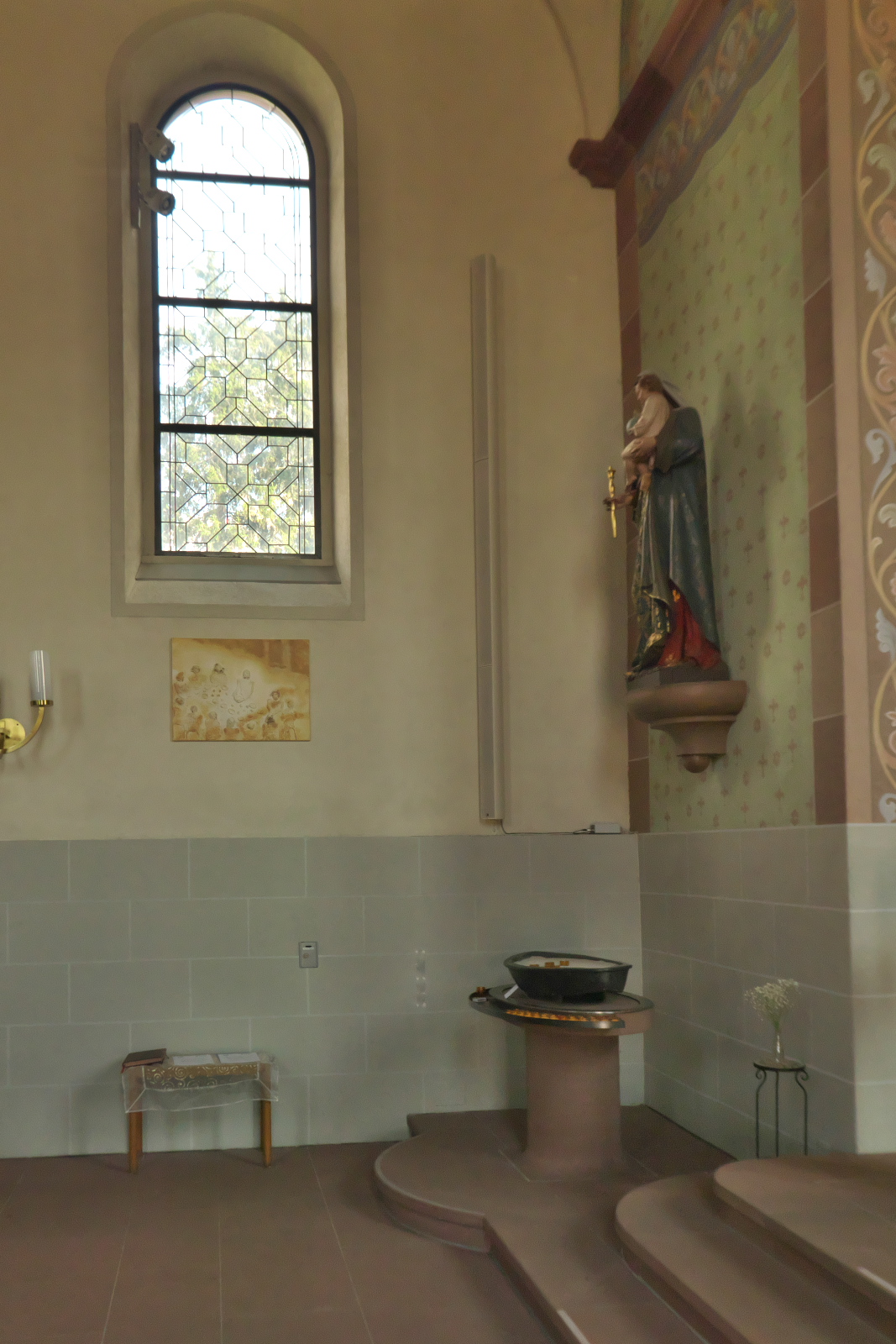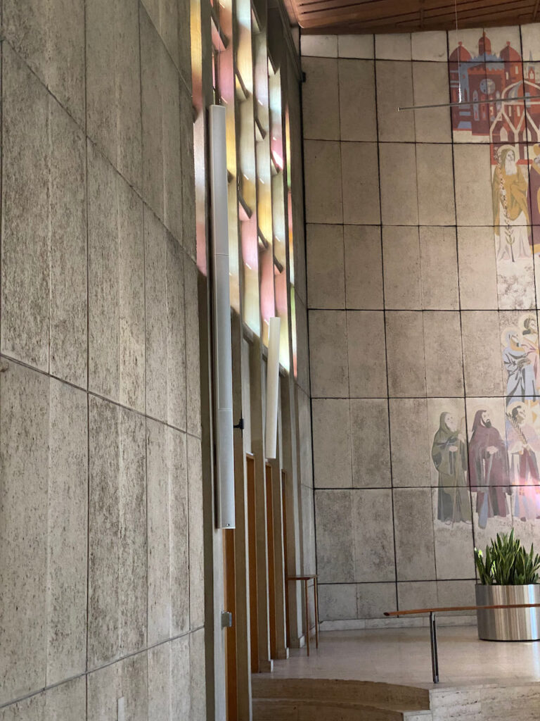 Ein Hauptlautsprecher links beschallt ca 2/3 der Kirchenbänke, die im Halbkreis angeordnet sind. Ein Nebenlautsprecher rechts im Nebenschiff beschallt die „Lücke“ diskret.