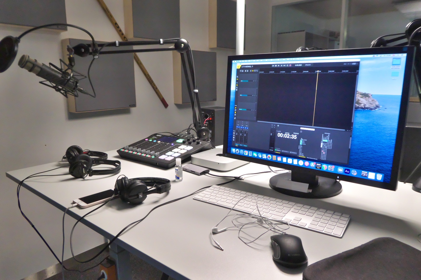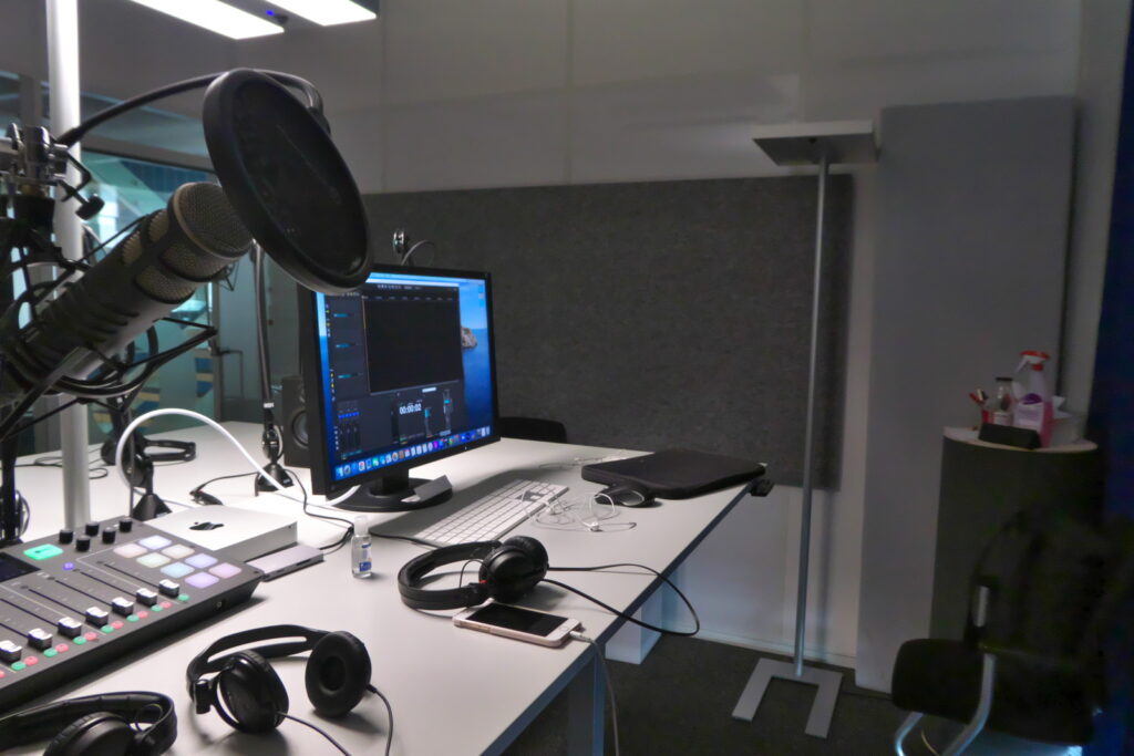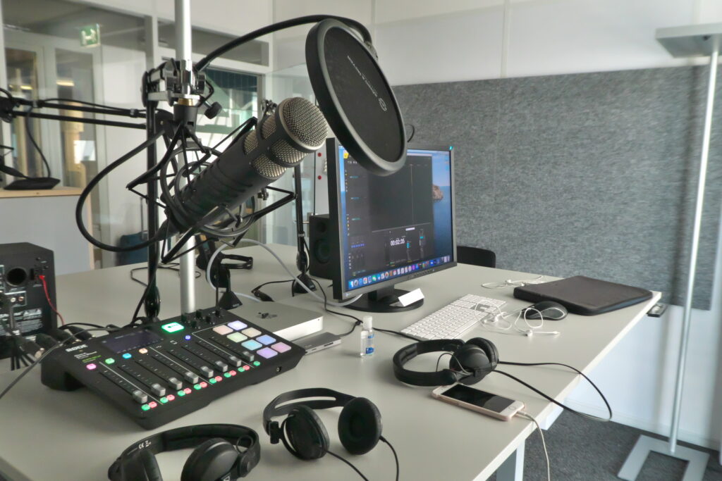 Vier Mikrofone, ein professionelles und einfach zu bedienendes Produktions-All inOne Gerät (RodeCaster Pro), akustische Massnahmen mit Absorbern und eine einfache Abhöranlage waren zu bauen.