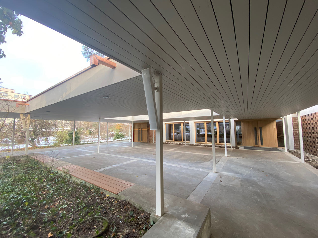 Im Aussenbereich ist eine 100V Beschallung installiert worden, die für Abdankungen mit Gästen im Aussenbereich genutzt werden kann. Neu sind auch zwei Funkmikrofone im Innen- sowie im Aussenbereich einsetzbar, so können Abdankungen auf Wunsch auch nur im Aussenbereich stattfinden.