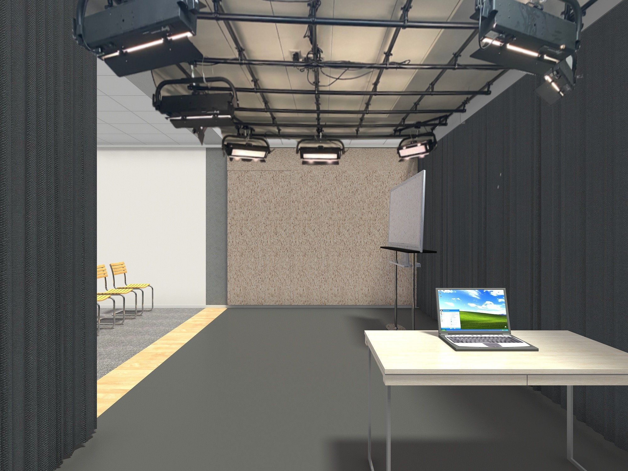 Visualisierung vom Videostudio, Blick in den ZuschauerraumVisualisierung TV-Studio VideoregieVisualisierung TV-Studio ModerationseckeMAZ Luzern TV-StudioDas neue TV-Studio: Lichttest mit dem farbigen Hintergrunddie neue TV-Studio Bildregie: TriCaster, Kamerasteuerung, LichtsteuerungMAZ Luzern PodcaststudioMAZ Luzern Podcaststudio