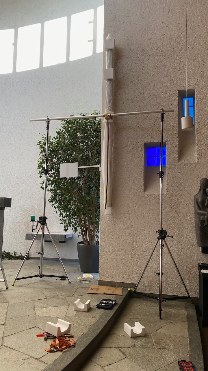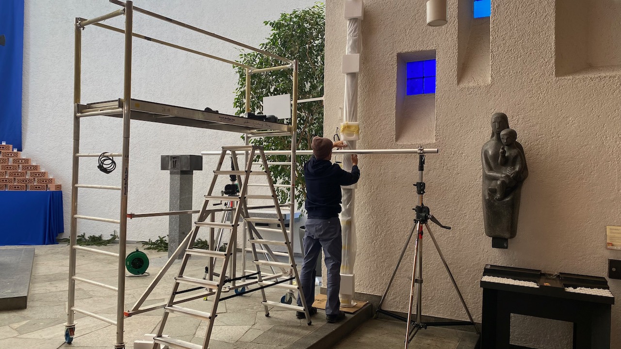 die ganze Kirche mit der Orgel links vorneEinmessen der TonanlageKirche Bruder Klaus BirsfeldenMontage des Lautsprechers mit Gerüst und KurbelstativLautsprechers hochgekurbelt und sicher fixiertDer neue Lautsprecher Fohhn DLI-330der schöne Kirchturm mit offener Wendeltreppe