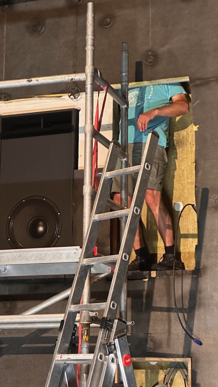 Die Anforderung war, eine optisch unauffällige, fix installierte Tonanlage zu bauen. Sie sollte für Ansprachen genau so geeignet sein wie für Theaterproben, Aufführungen und Musikdarbietungen. Auch mal laut die Musik aufdrehen auf Tanzlautstärke sollte damit möglich sein, die Bässe gut spürbar werden.