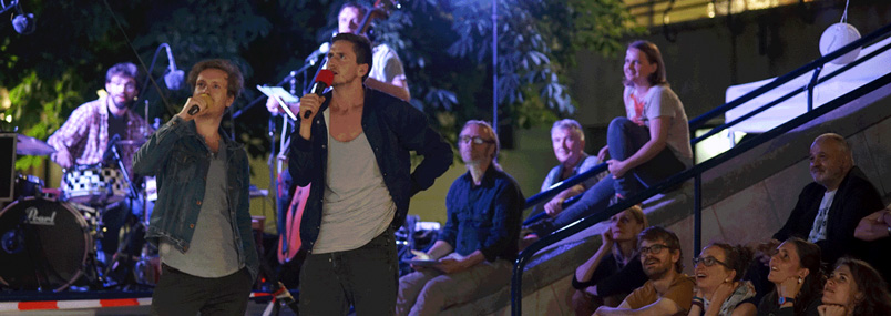 Für das Filmkaraoke mit Live-Band und Performancebühne vor der grossen Leinwand installierten wir die Beleuchtung und die Beschallungsanlage. Die Bilder dazu zeigen die gelungene Stimmung.