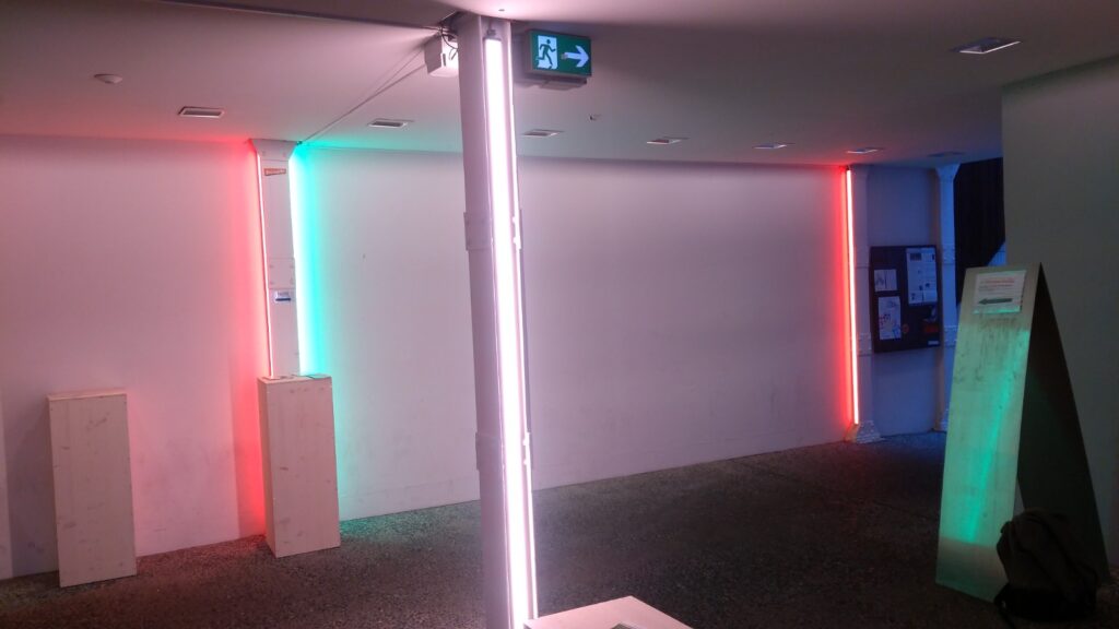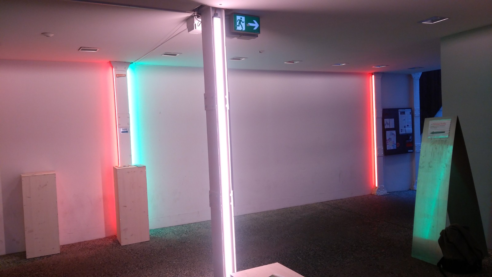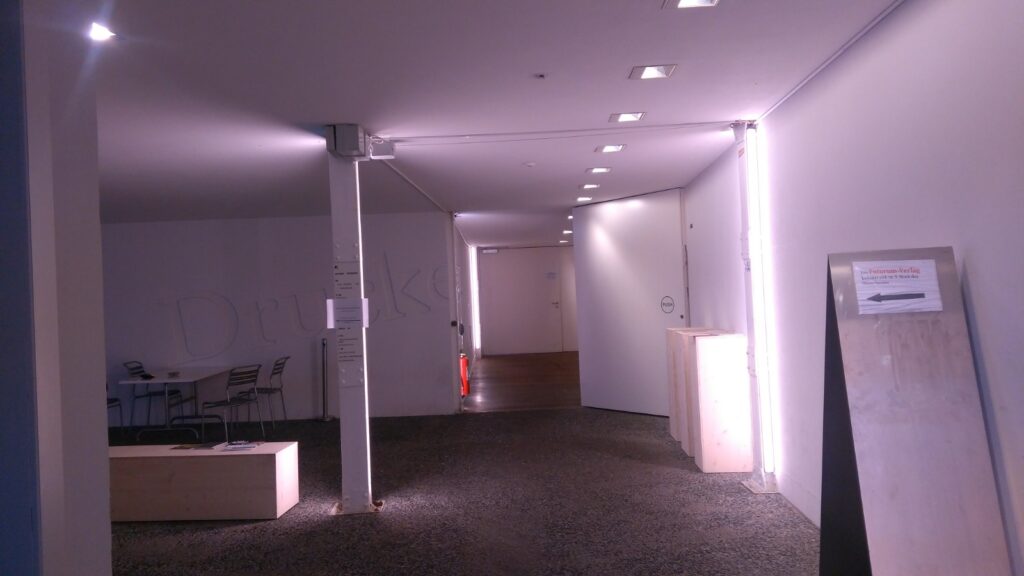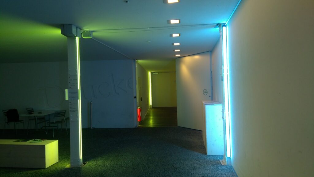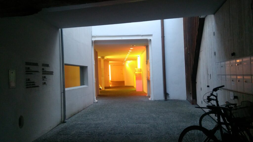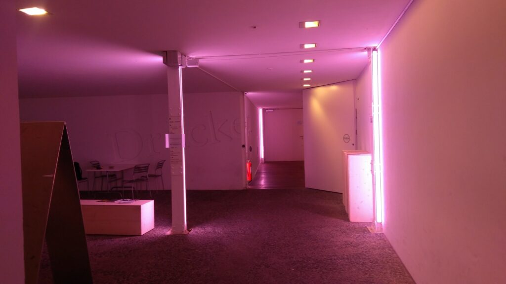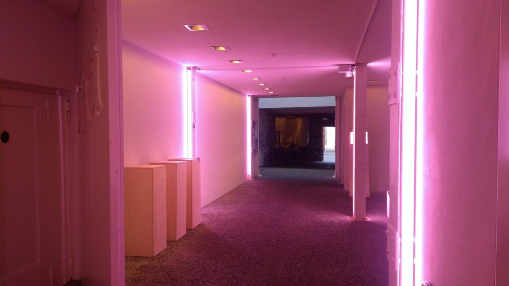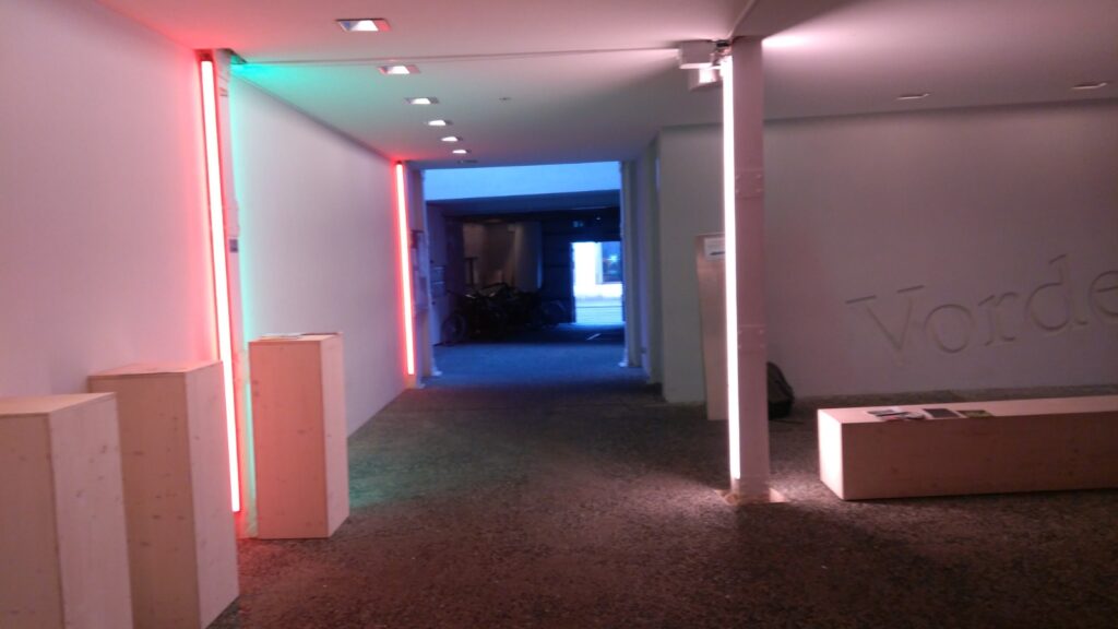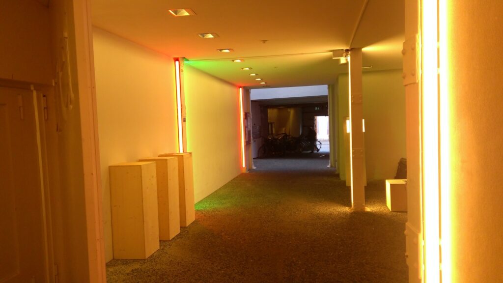 Was lange währt, wird endlich gut: Im Jahre 2017 planten wir, im gedeckten Teil des Innenhofs im Ackermannshof eine spezielle Lichtinstallation zu realisieren. Nun ist die Installation fertiggestellt und bereichert das Foyer und die Eingangszone in die Druckereihalle mir farbig einstellbaren Lichtsäulen.